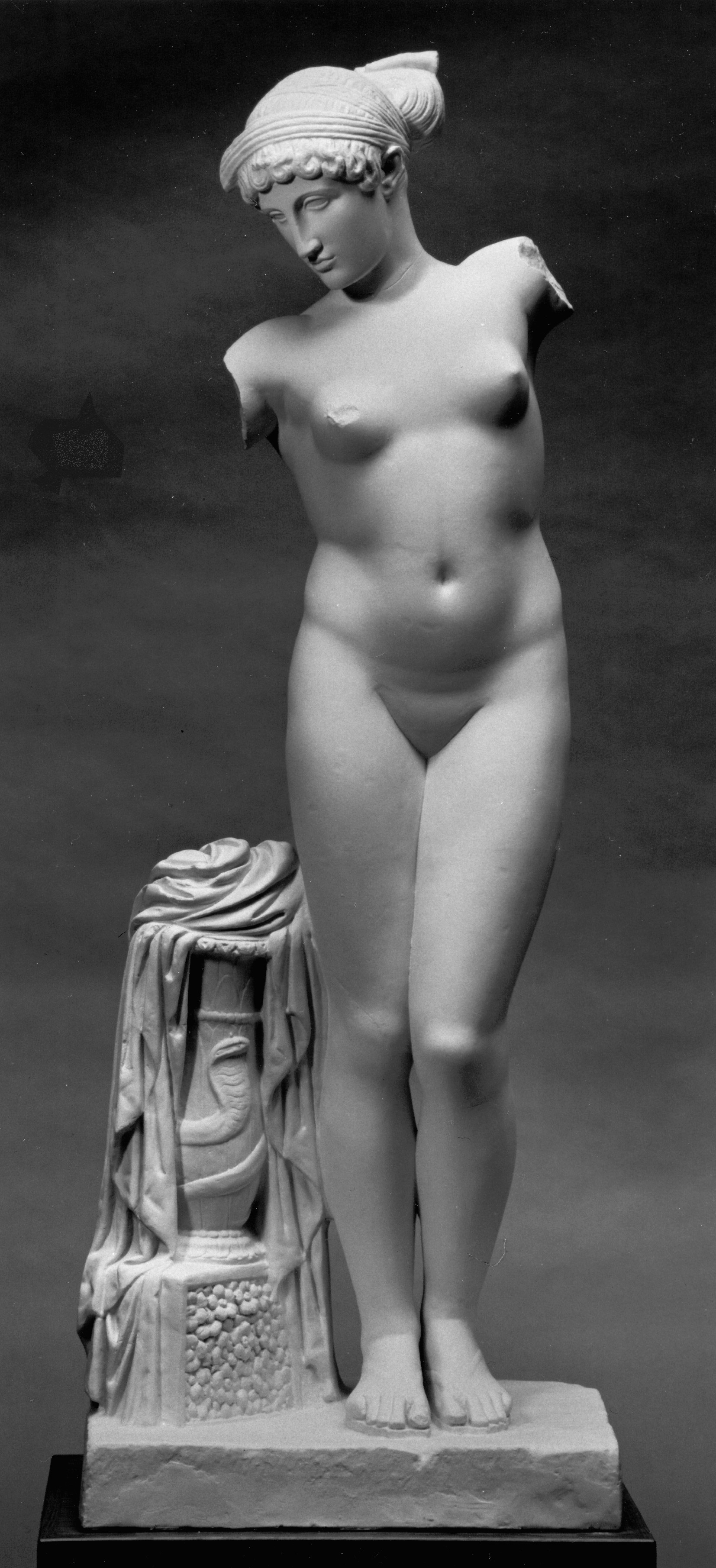 Die Darstellung einer sich eine Binde um den Kopf legenden Figur ist nicht neu. Die Großplastik überliefert sie am besten in der Statue des Diadumenos, einem von dem berühmten Bildhauer Polyklet im letzten Viertel des 5. Jhs. v. Chr. geschaffenen Bronzewerk, das in verschiedenen Marmorkopien erhalten ist, darunter die qualitätvolle Replik aus Delos im Athener Nationalmuseum (Abguß Inv. 1173). Das dem Diadumenos verwandte Motiv der esquilinischen Göttin, ihre strengen Gesichtszüge und die klassischen Vorbildern angeglichene Frisur (vgl. u.a. die sogenannte Penelope, Abguß DL 26), haben die ältere Forschung dazu geführt, sie zu den Bildwerken des 5. Jhs. zu zählen, eine Datierung, die längst zugunsten einer weitaus späteren korrigiert wurde. Das Hauptargument, das gegen die Entstehung der Venus im 5. Jh. v. Chr. spricht, betrifft die Nackheit; denn die erste unbekleidete weibliche Marmorstatue schuf der attische Bildhauer Praxiteles um 340/330 v. Chr. mit seiner im kleinasiatischen Knidos aufgestellten und von antiken Schriftstellern hochgerühmten Aphrodite. Auch dieses Werk ist nur in römischen Kopien überliefert (Abgüsse Th 160, Th 170 und Inv. 912). Sie stellen die Göttin im Typus der sog. Pudica dar. Hellenistische Varianten wie die Kapitolinische und die Mediceische Venus rezipieren diese Statue (Abgüsse Th 149 und Inv. 360, Th 100). Ein Vergleich dieser drei Aphrodite-Statuen mit der esquilinischen Venus zeigt, daß jene Figuren sich durch eine Dreidimensionalität des Körpers auszeichnen, die unter jedem Blickpunkt beim Umschreiten wirksam bleibt. Die esquilinische Venus hingegen ist auf die Vorderansicht konzipiert, in der allein sich Aufbau und Bewegung der Figur erschließen, während die Seitenansichten den Eindruck geringer Tiefe vermitteln.
